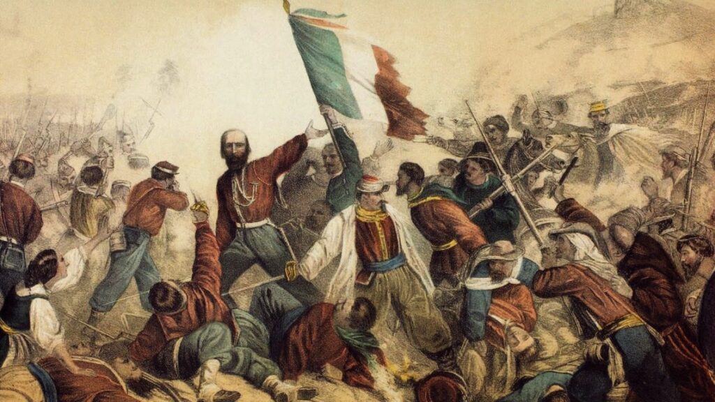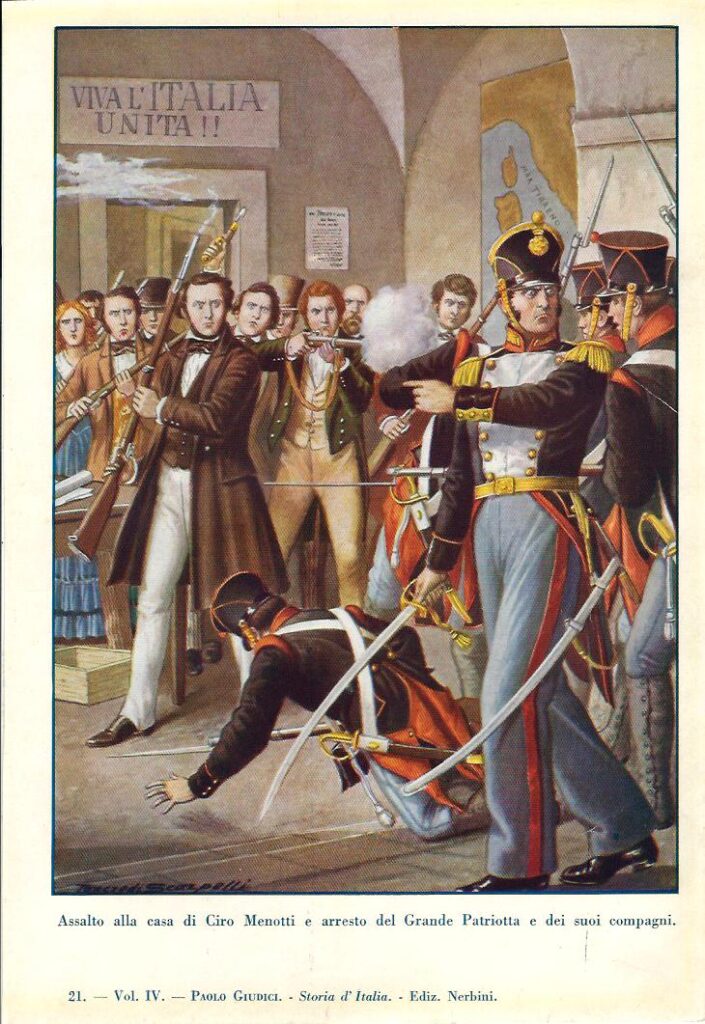 Map of Italy in 1815, following the Napoleonic exit from the peninsula. The Risorgimento movementAnother Map of Italy from 1815.A depiction of the Five Days of Milan by Baldassare Verazzi in 1886.Assault on the home of Cyrus Menotti and arrest of the great patriot and his companions, 1932. ByTancredi Scarpelli (1866 – 1937), Italian illustrator and designerNapoleon III at the Battle of Solferino, 1863, by Jean-Louis-Ernest Meissonier.Breaching the Porta Pia,Carlo Ademello, 1880. A depiction of the Capture of Rome in 1870.Scene from the Battle of Novarra, 1849, by Prina 1863Proclamation of the Kingdom of Italy and the first Italian Parliament, 1861, by Induno.Photographic print on carte de visite of Giuseppe Garibaldi (1807-1882), standing, facing front. Taken in Naples, Italy, 1861.A portrait of Mazzini, inspired by an engraving by Luigi Calamatta (1801-1869).